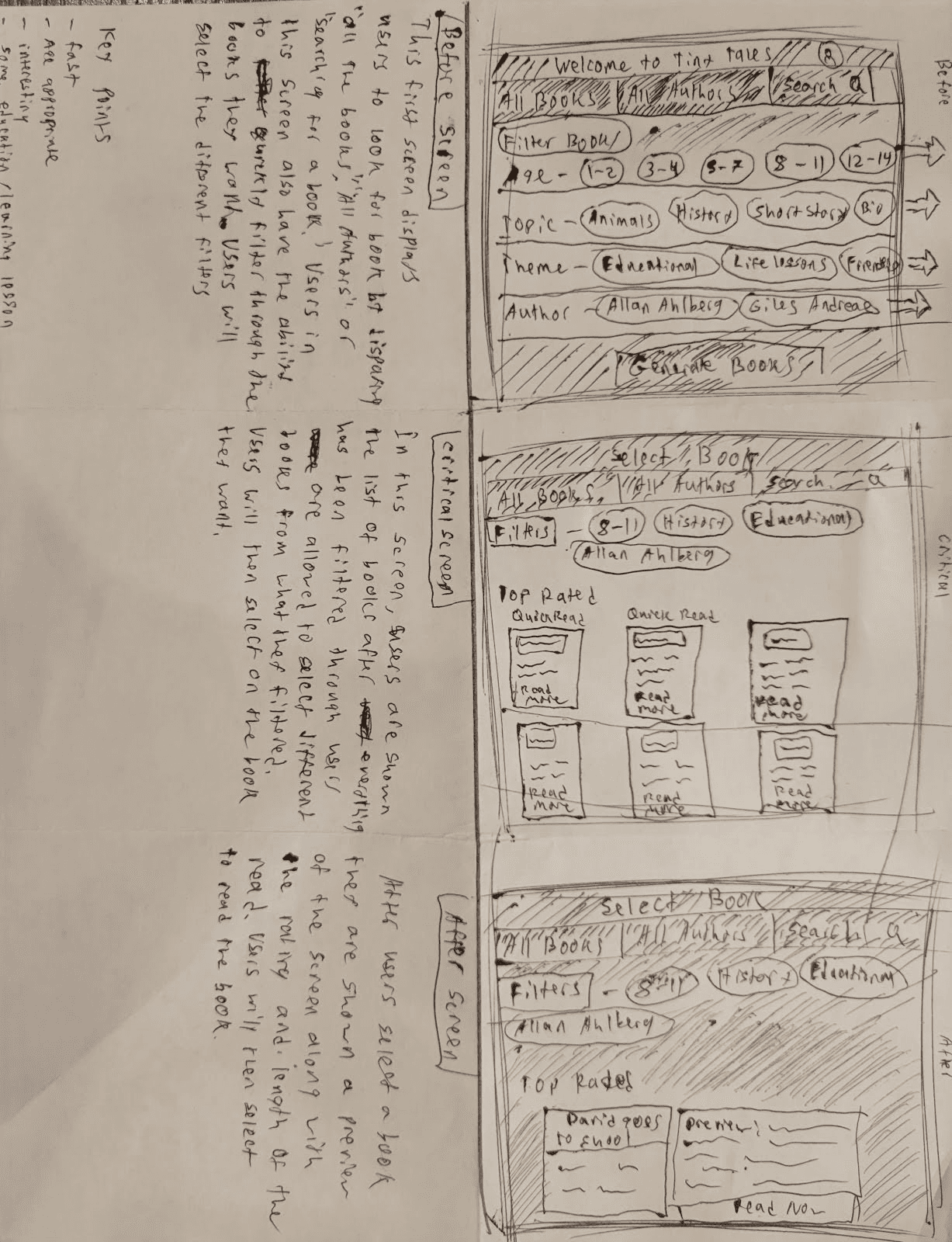 After the Crazy 8s designs I then decided to choose one of my sketches and continue to redefine. Since parents need to quickly find books with good ratings and books that fulfill their expectations, I decided that having a screen with multiple categories/filters was important to have. After the user selects the different categories, the app will proceed to show the user a selection of books with the best ratings. While keeping the format simple and standard, it would allow parents and their children to use it together.