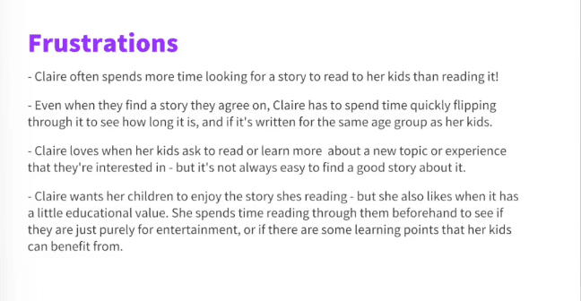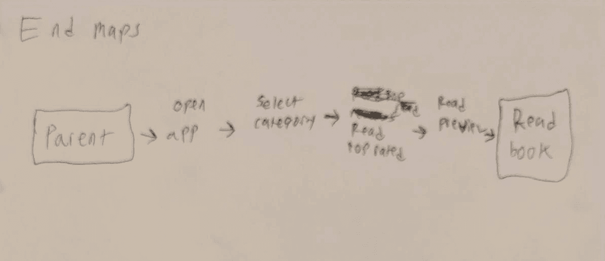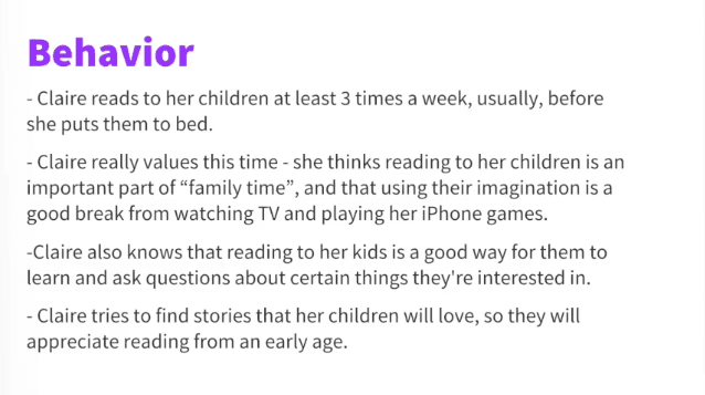 First, I had to read through the pre-conducted user research and recorded interviews with parents who use online books. Through all the research, I developed a few key insights. I learned that parents want to find books that have meaningful experiences and educational values to read to their children. I also learned that when parents choose books they focus on the reviews and ratings. Moreover, parents often want to preview the book before moving forward with reading. By quickly finding these deal breakers in books, parents are able to waste less time finding books and spending more time reading.