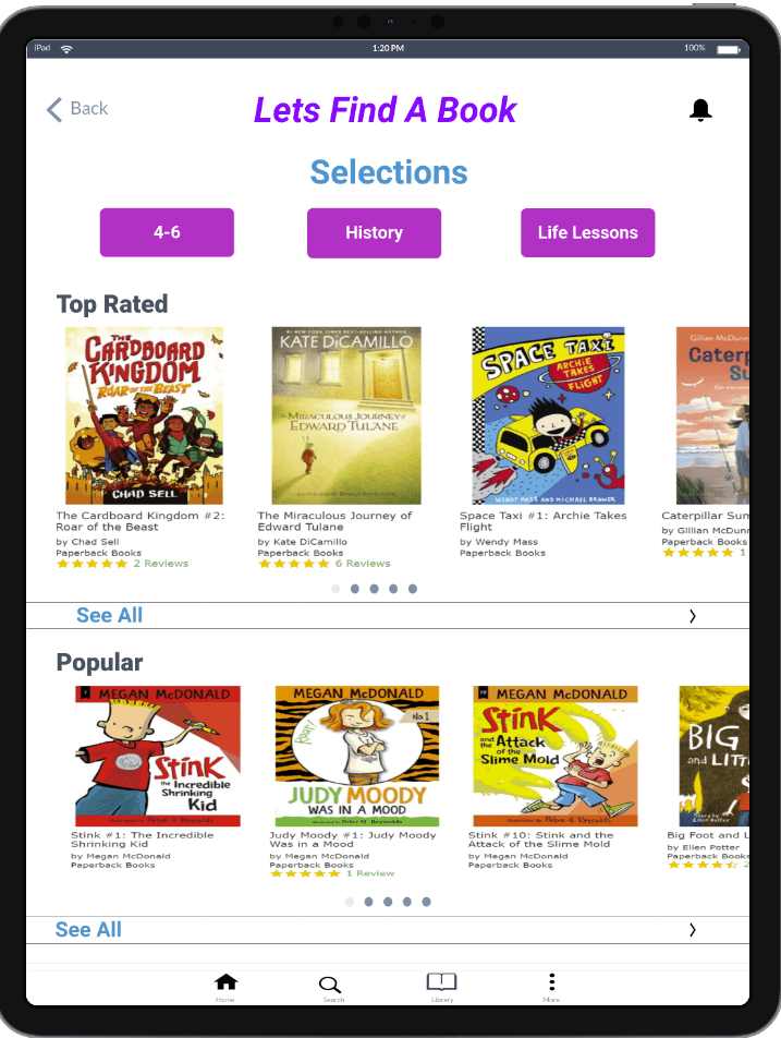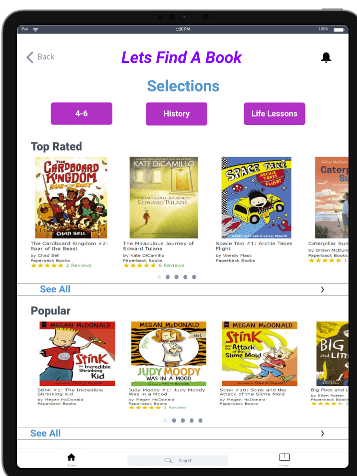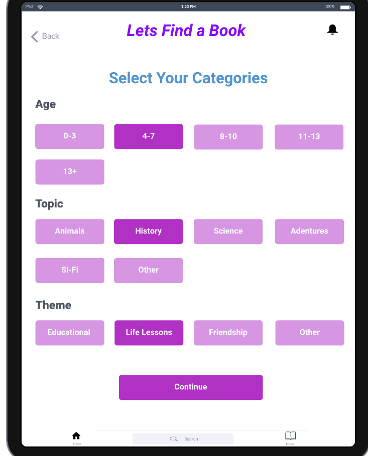 One of the major usability problems was the bottom navigation. Users were confused about what the search Icon displayed. To fix this issue, the bottom navigation tab will be changed into just 4 different icons across the bottom. This will help users focus more on the “Get Started” button at the top for parents in particular to focus on finding books.