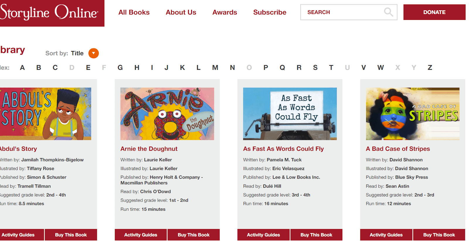 The "StoryOnline" website allows the user to watch a video of the book, buy the book, and allows the user to read a quick description. This website also allows users to search for books through different titles and through alphabetical order. Users are also allowed to access activity guides for the books that parents can access. It can still be difficult for parents to quickly find books due to the minimal filters.