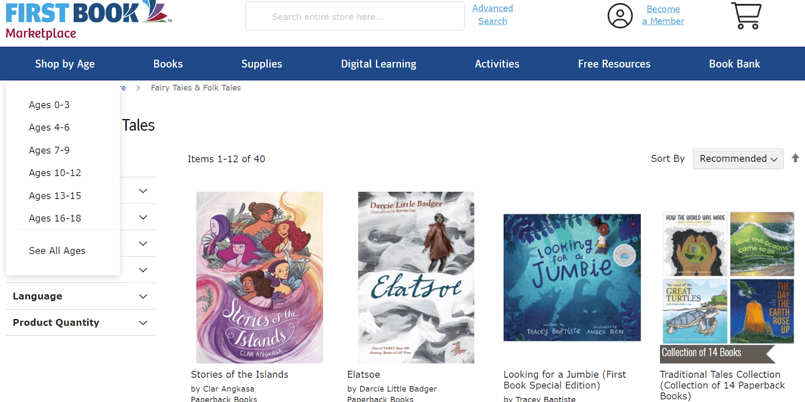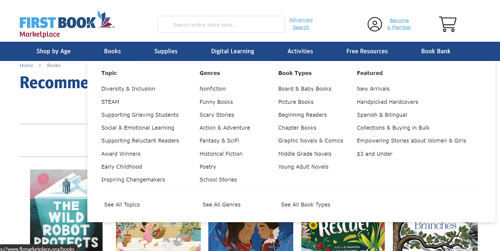 The "FirstBook" website mainly focuses on buying affordable books. Users are able to shop mainly through age groups, or learning topics. The majority of the library is educational books for kids. Books on the website are to be mainly bought for physical reading or Rereading. Some books on the website lack reviews for users.