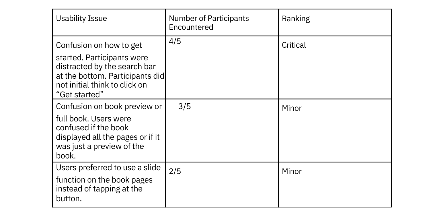 The second usability problem was the fact that some users were confused if “Read Now” showed the entire book or just a preview. In order to fix this problem a preview feature can be added to allow parents to distinguish between the entire book and reading a few pages before.