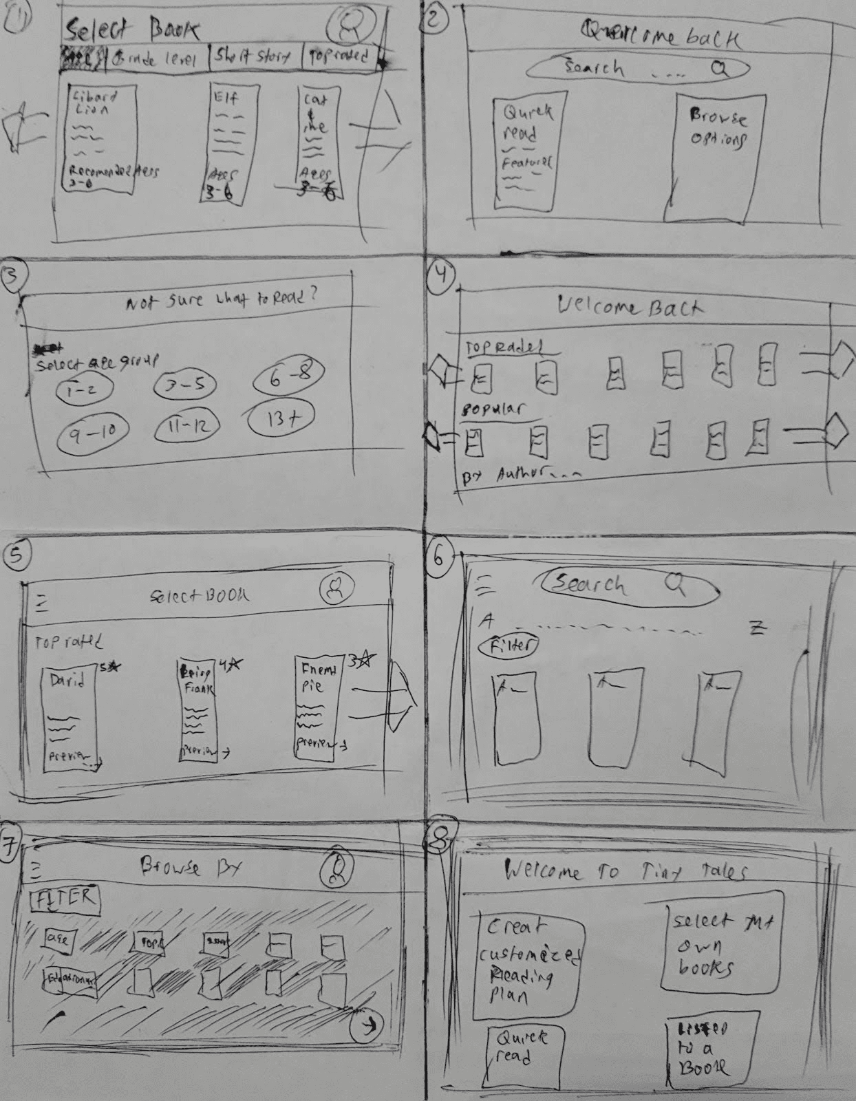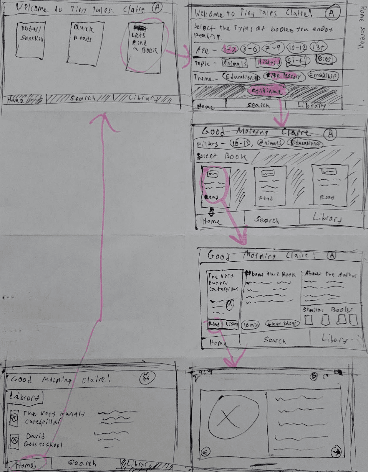 Then, I quickly mapped out four End to End experiences for the Tiny Tales app. These maps help me visualize how users will potentially accomplish their task of quickly finding books. I decided to go with my first End to End honey map as a blueprint for my design.