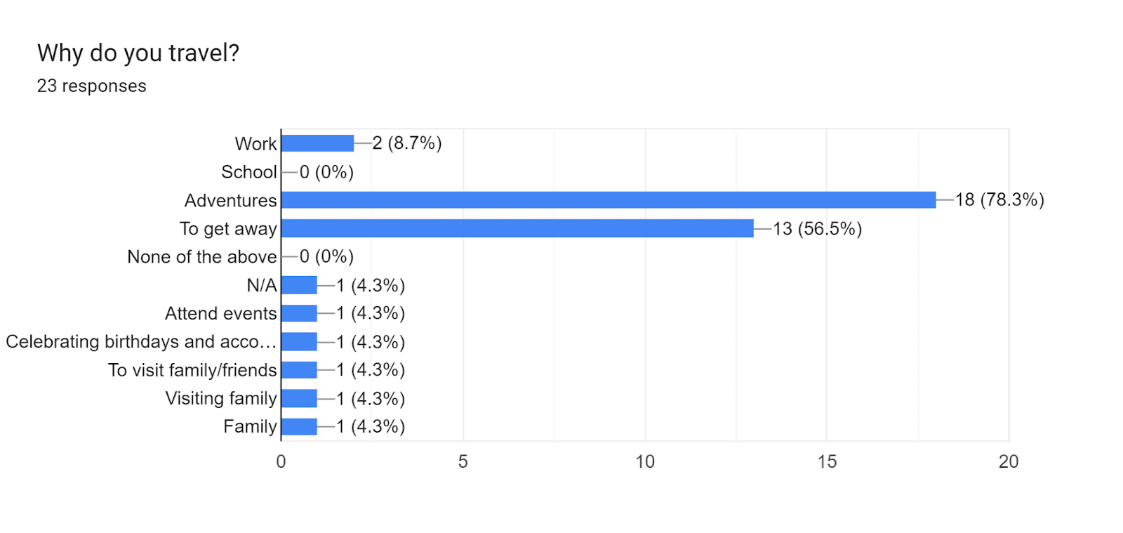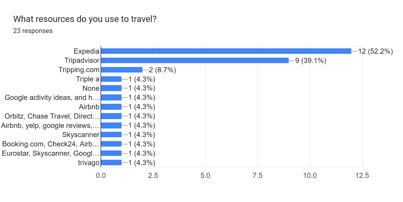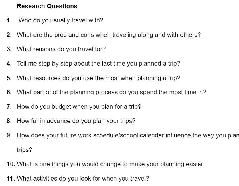 I began the research process by investigating research studies and articles. I also focused on obtaining a deeper understanding of my target audience and the painpoints they face. In order to gather these insights, I distributed a screening survey to various individuals. I received a total of 20 responses and selected individuals who have traveled at last once per year and who like to plan their trips. I proceeded to conduct in-depth interviews with these selected individuals.