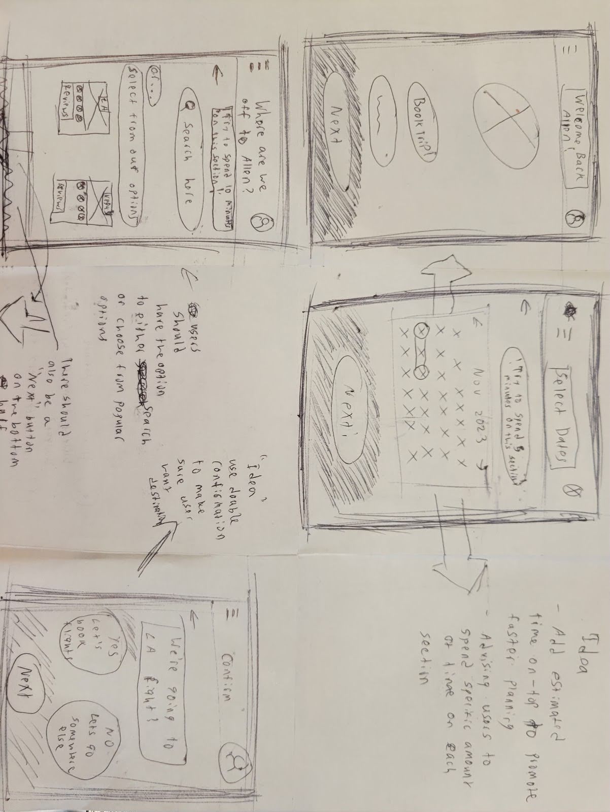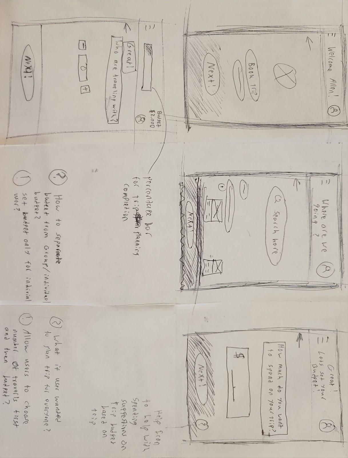 After synthesizing my research and defining my observations, I began the design phase by creating low-fidelity sketches and wireframes. These sketches were based on user interviews, project goals, heuristic evaluations and site maps. These sketches helped me to quickly explore different ideas for Travel Pal before committing to digital designs. Throughout these sketches I focused on incorporating all booking aspects for a trip, (flights, hotels, destination), recommendations, communication within, and a budget.