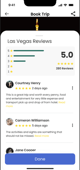 To address these issues, I was able to make some adjustments and proceeded with a second round of testing. For example, I add reviews for all the bookings for users to read through and reassure their decision. Moreover, I also changed the sharing feature and made the groups within the app more accessible for sharing. Lastly, I decided to remove the decimal in order for users to quickly set whole numbers and not spend too much time adding decimals.