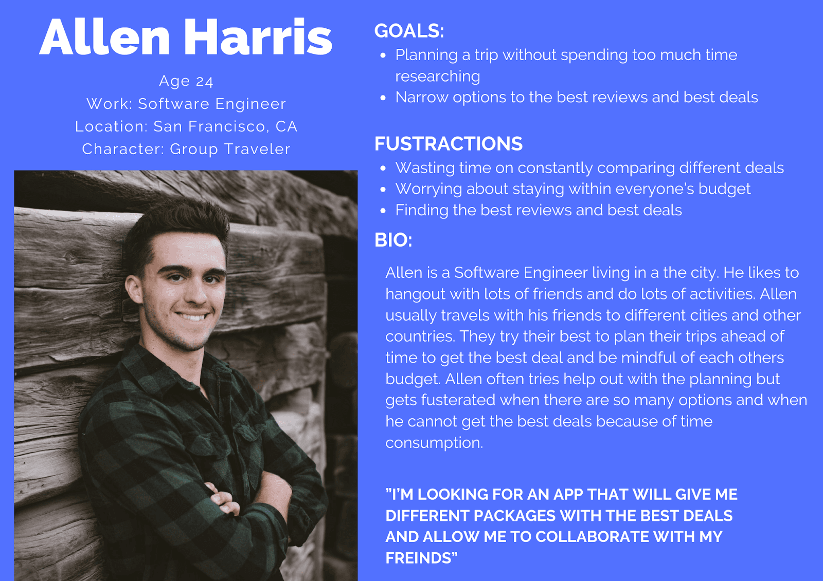 People around the world usually are able to take time off work to take trips. People often spend time planning their trips and comparing options. This situation causes frustration which leads to people rethinking if they should take trips or even obstruct their entire travel experience. Travel Pal aims to reduce the frustration and create a seamless and stress free planning experience.