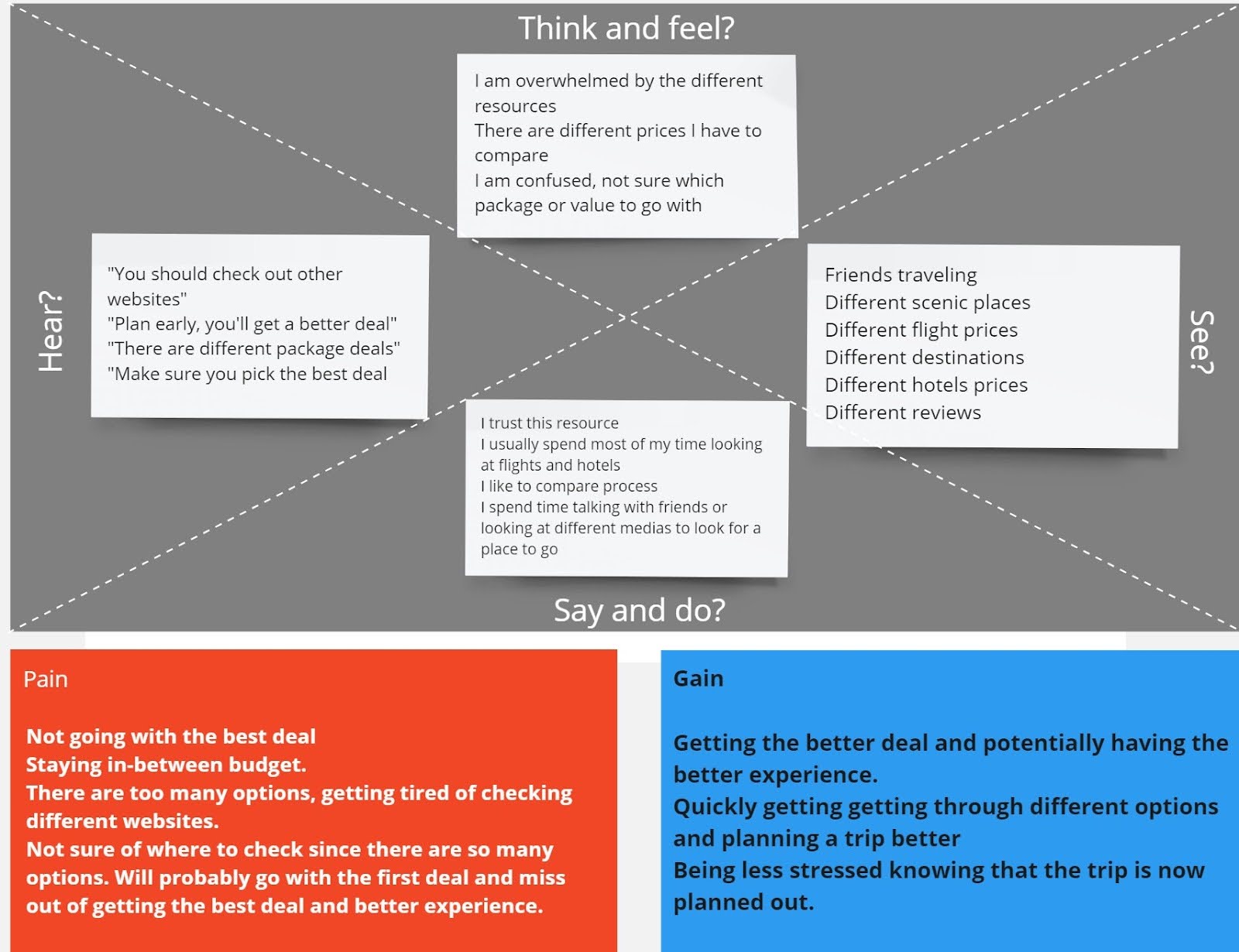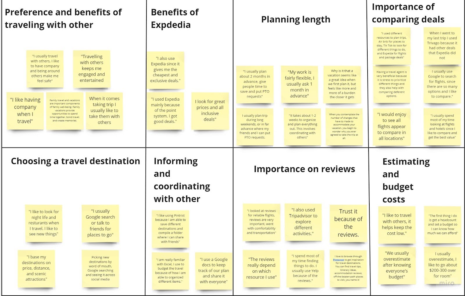 In order to synthesize my research, I created an affinity map to find and group major themes. I found that users had multiple similarities. For example, I learned that most users tend to use more than one site when booking a trip. Some started to use Expedia then used Trivago to find the best deal. Some claim they always check other sites because they look for better deals. I also learned that users almost always look at the reviews before a booking because they want to know what others think. Moreover, users expressed their importance on communication among others when planning. Users almost always travel in groups, therefore, it is important for everyone to be on the same page.